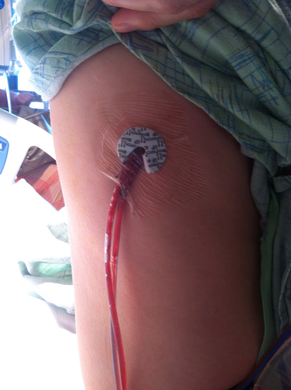The plastic circle is a port. The plastic surgeon uses a magnet to locate the port and inserts the needle through my skin. He adds a small amount of saline at each visit.